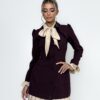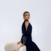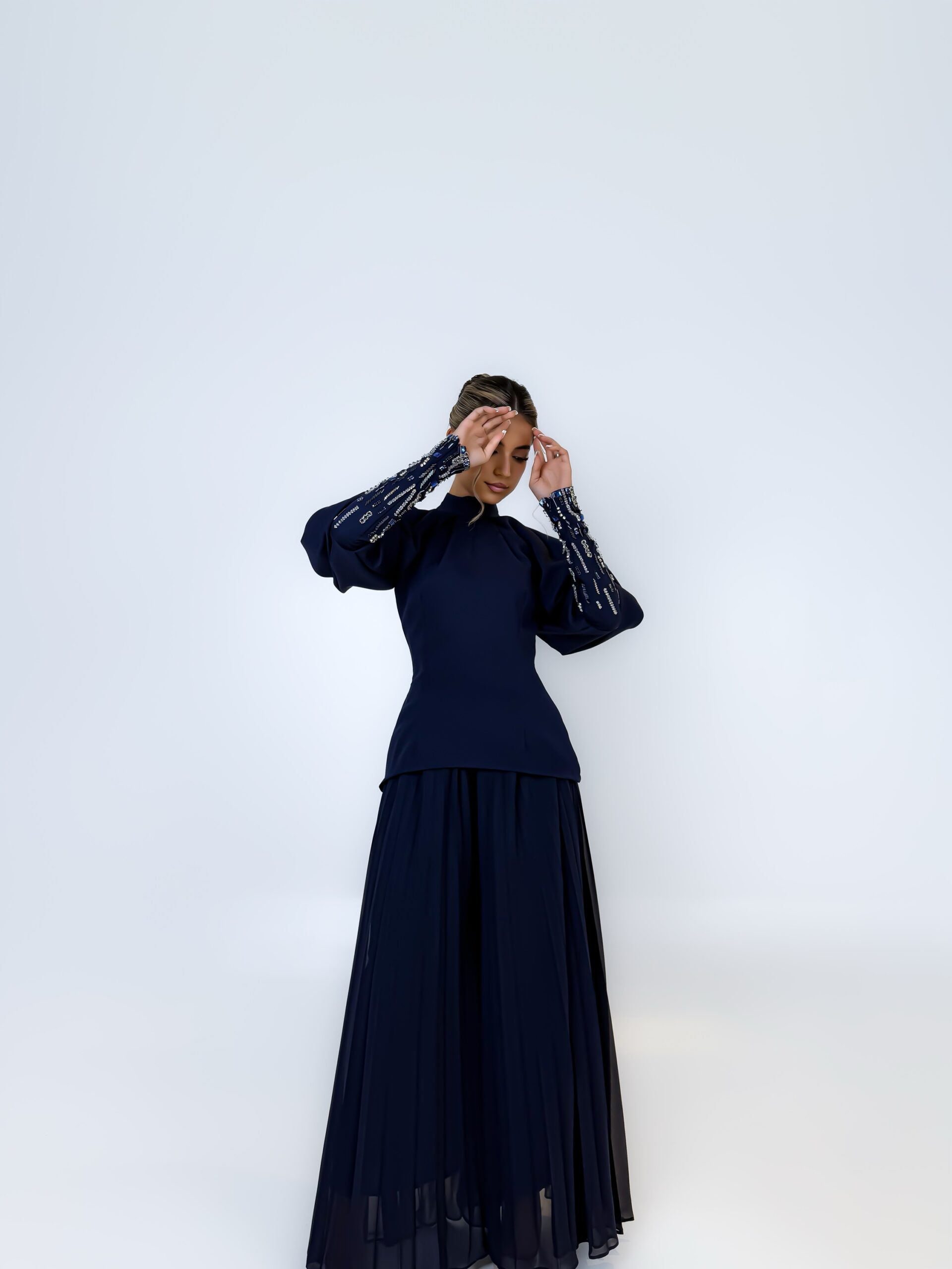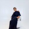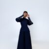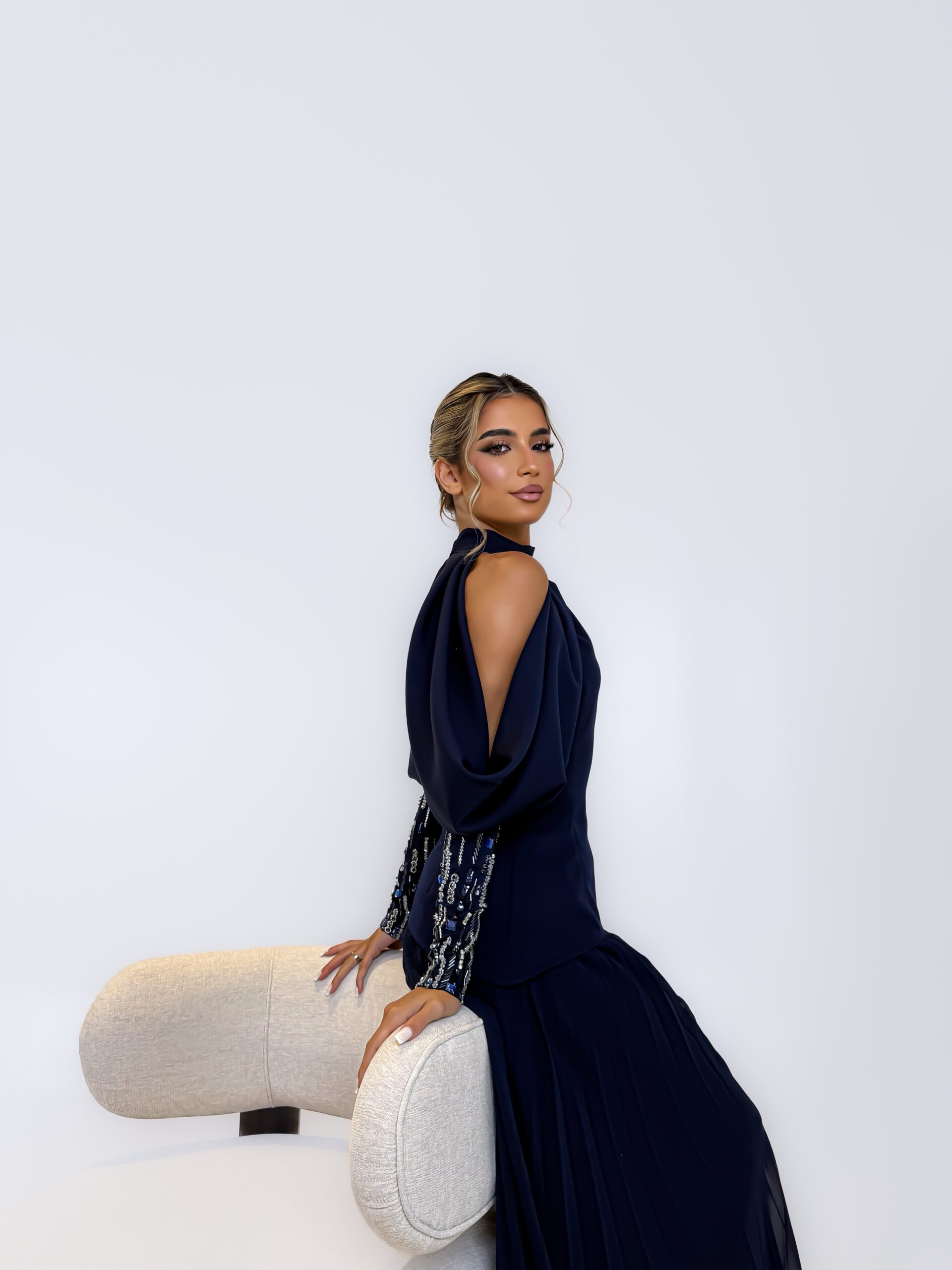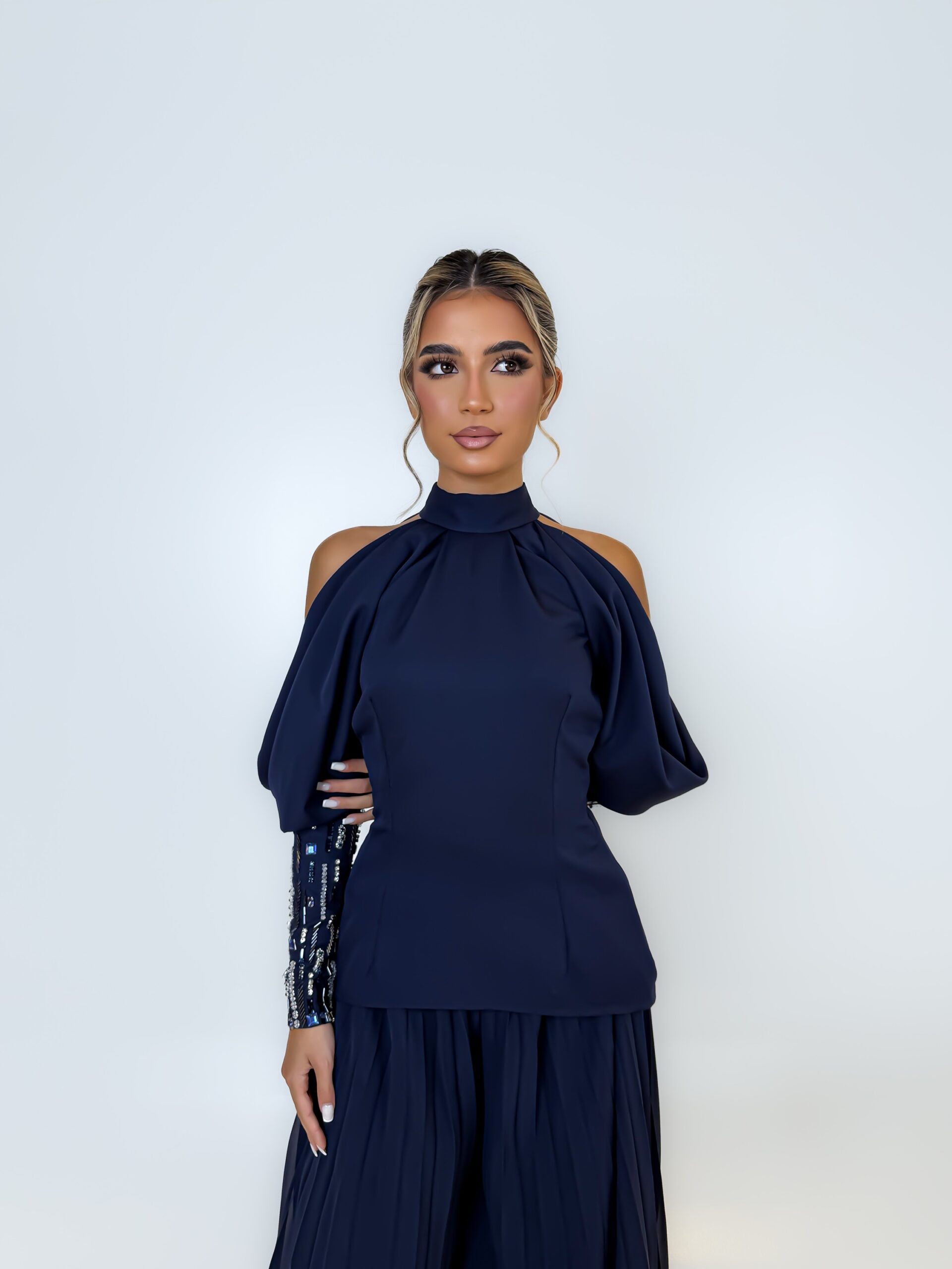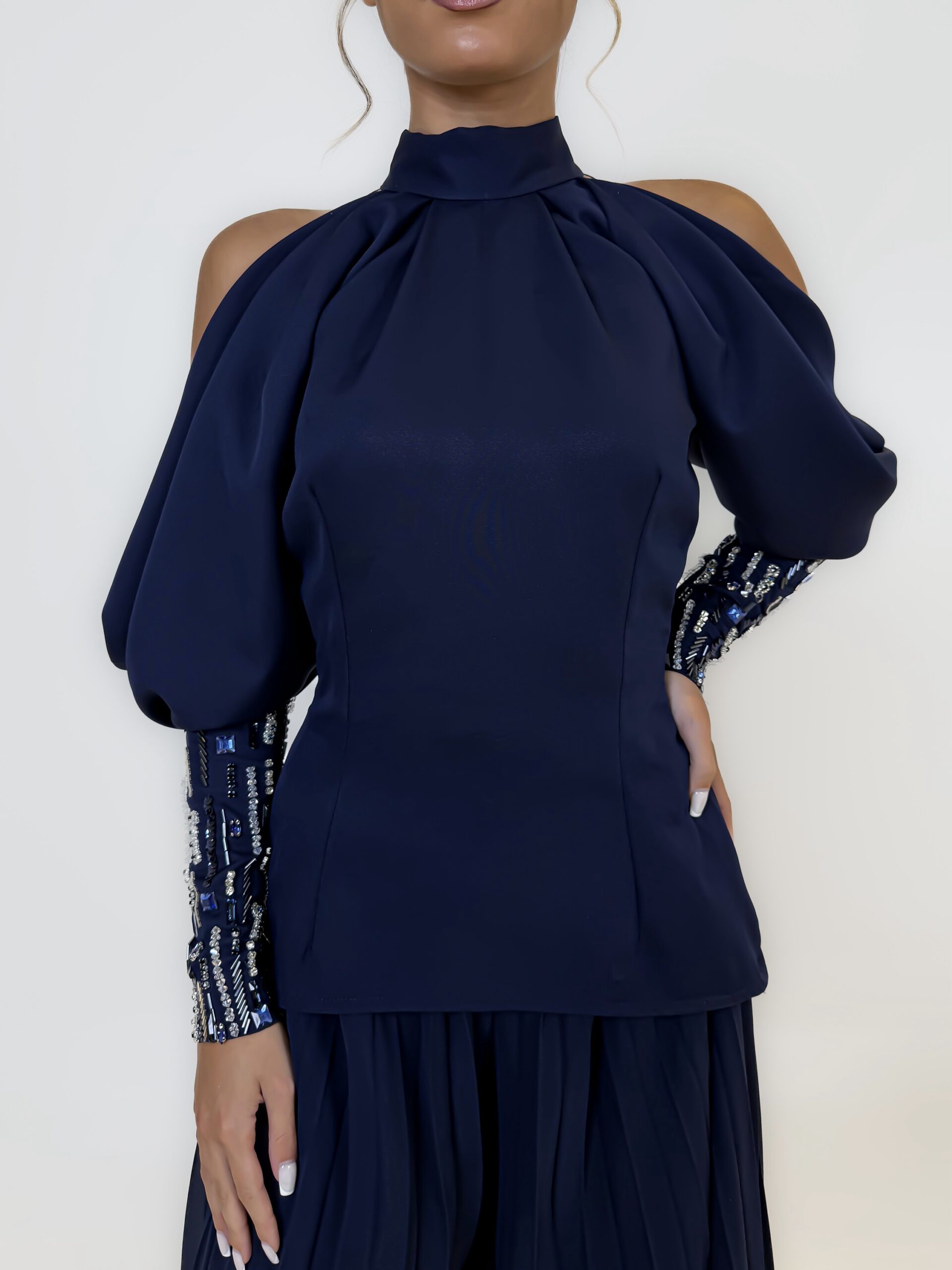 توب بلون كحلي بتصميم مفتوح الأكتاف، وتفاصيل تطريز يدوي مشكوك باحتراف على الأكمام تضيف لمسة لامعة تُبرز جمال اللون ، يأتي مع بنطلون بليسيه انسيابي يمنح إطلالة متكاملة تنطق بالفخامة الصامتة